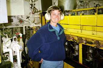August 30, 2005 Same deal as yesterday with the weather...high winds and rough seas, and the same deal with the cetaceans...short-beaked common dolphins riding the bow. Again, it was such a joy to watch them play! There are always some factors that limit or restrict scientific operations, and rough seas while doing a cetacean study is definitely one of them. When the Beaufort Scale is 5 or greater, it is too difficult to search for marine mammals. We had swells up to ten feet, and whitecaps as far as we could see. I learned that a few extra days have been built into the CSCAPE legs for days like this; days where it is impossible for the mammal observers to be on effort. It sounds similar to what schools are thinking when they add snow days to the calendar. Even though the scientists get a day off, the crew must continue to work. According to the Chief Marine Engineer Howard Boswell, the ship and crew provide all of the services of a small city. With no whales to watch today, I took a tour of the engine room. Five men keep the David Starr Jordan's engines running smoothly while providing us with necessities such as electricity, air conditioning, refrigeration, and water. What I found most interesting was where all of our fresh water comes from. We have thirty people on board, all drinking water, taking showers, and doing laundry, not to mention the water the cooks are using to prepare our meals. That is a tremendous amount of water needed on a daily basis. Howard explained that we are using the sea water that surrounds us. The ship draws in the ocean water, distills it, passes it though a filtration system, and then it is ready for us to use. So living on the Jordan is like living in a small city, and Howard and his men provide us with many of the things we need to survive.