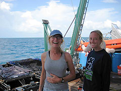 Today has been packed, but had a chance to ask graduate student Martha Hauff a few questions. She will be writing her thesis proposal on larval fish ecology this fall. Her PhD. research is also supported by this grant and involves looking at the condition (health) of fish larvae. On board she is busy picking out reef fish larvae and quickly freezing them for analysis later. Even though she grew up in Colorado, she developed an interest in marine biology during visits to Bermuda. She went to Claremont College near Los Angeles as an undergraduate. For fun she runs 10K and marathon races.