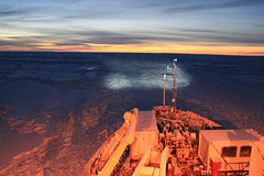 December 23, 2007 Position 71° 13.717' N 124° 10.421' W The engines started right on time this morning at 10 am. We headed about 50 nautical miles south of our position to our first sampling station of Leg 5. The crew was nice enough to let us watch them maneuver the ship through the ice. They didn't mind our presence on the bridge so long as we stayed quiet and out of the way so that they could focus on their jobs. The ship slowly completed a 30 point turn, backing up, and going forward while turning slightly over and over again. The ship can't back up into heavy ice because of the damage it might inflict on the propellers and rudder, so it has to create a space to turn around in. It cannot simply turn in a big wide circle because this would waste too much fuel breaking through the meter-thick ice. The idea was to follow the same path out of the land-fast ice (ice that is attached to the land) in order to save fuel as this ice will be much thinner than the ice that surrounds it. The ship can simply carve through thinner ice, but for thicker sections it is designed to ride up on top of the ice sheet, then crush it with its weight. One of the officers on deck told me that the ship is run by eight diesel generators. Three of these are used to power the ship, and the other five supply energy to the motors. When the ship is traveling through heavy ice as we will be doing today, it can burn 55 metric tons of diesel a day. In open water, the Amundsen burns one sixth of that in a 24-hour period. This is why the scientists and crew must be very careful when choosing the station. If they stop in the wrong place and the currents move the boat too fast, they must constantly correct by burning fuel. There is no refueling option for months. What we have onboard is what we will use until May. I headed out to the bow after lunch to witness the icebreaking up closer with Elizabeth Shadwick, graduate student from the University of Manitoba, and Bruce Johnson, a research associate also with U of M. The Amundsen soon encountered a ridge line of fairly thick ice that it was not immediately able to overcome. After three attempts of getting a running start, she finally rode high up on the ice and came crushing down through the ice. Words really cannot do justice to what I saw, heard, and felt as we made are way through the ice pack. I will try as hard as I can to describe to everyone when I get back what it was like but I will fall miserably short. This was simply one of those things that you have to experience for yourself. I am so lucky to be here.