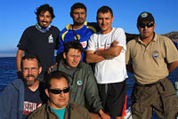 September 12, 2008 We sailed around Santiago Island and anchored at Bartolome Island, a very busy tourist location with many cruise boats tied up at moorings installed by the Park. This is the most people that we have seen since we left Porta Villamil. An interesting thing happened while we were there, the Ecuadorian President was in the area making an official tour. I was able to glimpse him as his boat sailed by. The survey crew went out this morning in the panga for a quick survey of a couple of areas. We went ahead in the Queen Mabel and anchored in a beautiful protected area to wait. While there, Pete and Andrea went snorkeling from the Zodiac. I went along and was asked by Pete to warn them if a tourist boat came into site. Apparently even though we were on a scientific expedition we did not have the proper authorization or park supervision to be in the water in this location. A boat did come into the area and I was able to warn Pete and Andrea in time to get out of the water before being seen. When the panga returned we weighed anchor and headed to Rabida for another short survey. Judging from the landscape Rabida is a much older island. It is covered with Opuntia Cactus and the Palo Santo tree, an aromatic tree that is endemic to the Galapagos Islands. The island appears to be much more weathered and eroded than other islands that I have seen with the exception of Santa Cruz. From the boat it appears as if it has had time for soils to develop. We sailed into a large population of perhaps 150 Blue Footed Boobies feeding at Rabida Island. I don't think that I could ever get tired of watching them. The birds cruise at various heights above the water watching for schools of fish. When fish are sited they tuck their wings in and dive at great speed, head first, into the water. They are so streamlined when they dive that when they hit the water they hardly make a splash. They pop quickly to the surface, float for a moment, and then are off to hunt some more. They are very cool birds! The survey is winding down and is finishing earlier than planned. Overall there were fewer Penguins and fewer nest sites counted. I will have to wait to get the final report to see the exact numbers. The early finish to the survey is not entirely bad for me. Because of the late start if the survey had lasted as long as predicted Gustavo would have had to drop me off at 4:00 am on the 14th at the Ecuadorian Dock on Baltra Island. I am not sure how the Navy would have reacted to lone American in their dock in the middle of the night! As it is now we should be in Porta Ayora by 6:00 am tomorrow. The wind and the currents were with us this evening. We made it back to Porta Ayora and anchored by 9:00 pm. Only a few of us stayed on board for the night. I did not have anywhere else to go so I had to stay. Tomorrow we unload the equipment and put it all away in the Gustavo's lab at the Station. Then I am going to find decent hotel for the night.