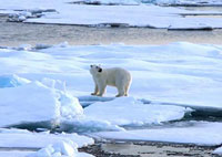 August 23, 2008 I woke up this morning to find out that the night watch saw a polar bear at about 5am. Trying to hide my jealousy, I spent the next two hours up on the bridge scanning for bears, but no luck. We have hit an area of thick ice, with many floes four to six feet thick at the water line and remnants of pressure ridges that are thrust above the ice another eight feet or so. This is a good environment for bears, and everyone is keeping their cameras handy in the event one happens to be spotted. I've heard that last year at this same time fourteen bears were spotted, and at about halfway through our cruise we've only seen one. I did see a few fresh tracks of bears, though. Well, it's something!