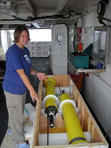 August 11, 2008 Today I had some time to learn about ARGO buoys from Ryan, the oceanographer onboard. An ARGO buoy is a small autonomous, torpedo shaped device that is deployed from a ship out at sea and they record the conductivity, temperature, and density of the water column. Once a buoy is deployed, it stays at the surface for 10 hours and then slowly sinks to 1000m collecting the data from the surrounding water. It runs on a 10-day cycle, which means that on the last days of the cycle, it sinks to 2000m and records information as it slowly rises back to the surface where it transmits all its data via satellites to an international database. Once the data is transmitted, it slowly starts its descent to 1000m to repeat this cycle. The buoys are able to record and transmit information for 5 years before the signal dies out.