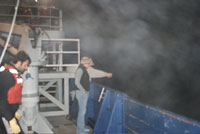 Even a perfect day can change quickly. At 6:00 pm the sky was blue and full of sun and the temperature was near 75°F. The ship was heading south and hit a wall of fog, only five minutes later visibility was measured in feet. Still the work goes on as the crew awaits a CTD to return to the surface.