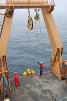 August 8, 2009 Because of the constant light outside, my whole sense of time has been thrown off. For those people who have known me for years, this is the first time in my adult life that I have ever worn a watch, and I am already depending on it. The first of the science experiments to be performed from the Healy was the recovery of two HARP (High-frequency Acoustic Recording Package) moorings by Ethan Roth from the Scripps Institution of Oceanography in San Diego. A year ago, Ethan coordinated the launching of two devices in separate locations to record the sounds in the ocean. Ethan will explain the science behind the equipment at one of our nightly science meetings, so I will save that for a later entry. Twice during the night/following morning, Ethan and three Coast Guard members were lowered overboard in a small boat, called a RHIB (Rigid Hull Inflatable Boat). They rode through the fog to the GPS coordinates, using acoustics to locate the mooring and then estimated the current flow and drift so they could be as close to it as possible when it came to the surface. Once they had that figured out, they sent a unique acoustic signal to the mooring to release its ballast (extra weight) and rise from approximately 300 meters to the surface. The first of the moorings came up right next to the ship. The people in the RHIB used a boat hook to secure the equipment and to get it ready to be hauled onto the ship. Once it was attached, other crewmembers used the winch to lift it onto the fantail (the back, lower deck of the ship).