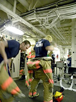 After 9/11, the Coast Guard was put under the jurisdiction of the Office of Homeland Security. Although their main function on this cruise is to support the scientific research, the crew members still need to be trained to ensure the safety of anyone in peril at sea. Many members of the Healy crew have performed search and rescue along the coasts, have had to control fires on various ships, and have saved numerous lives - often while risking their own. On this September 11th, it is appropriate to honor them for their bravery and commitment. |
